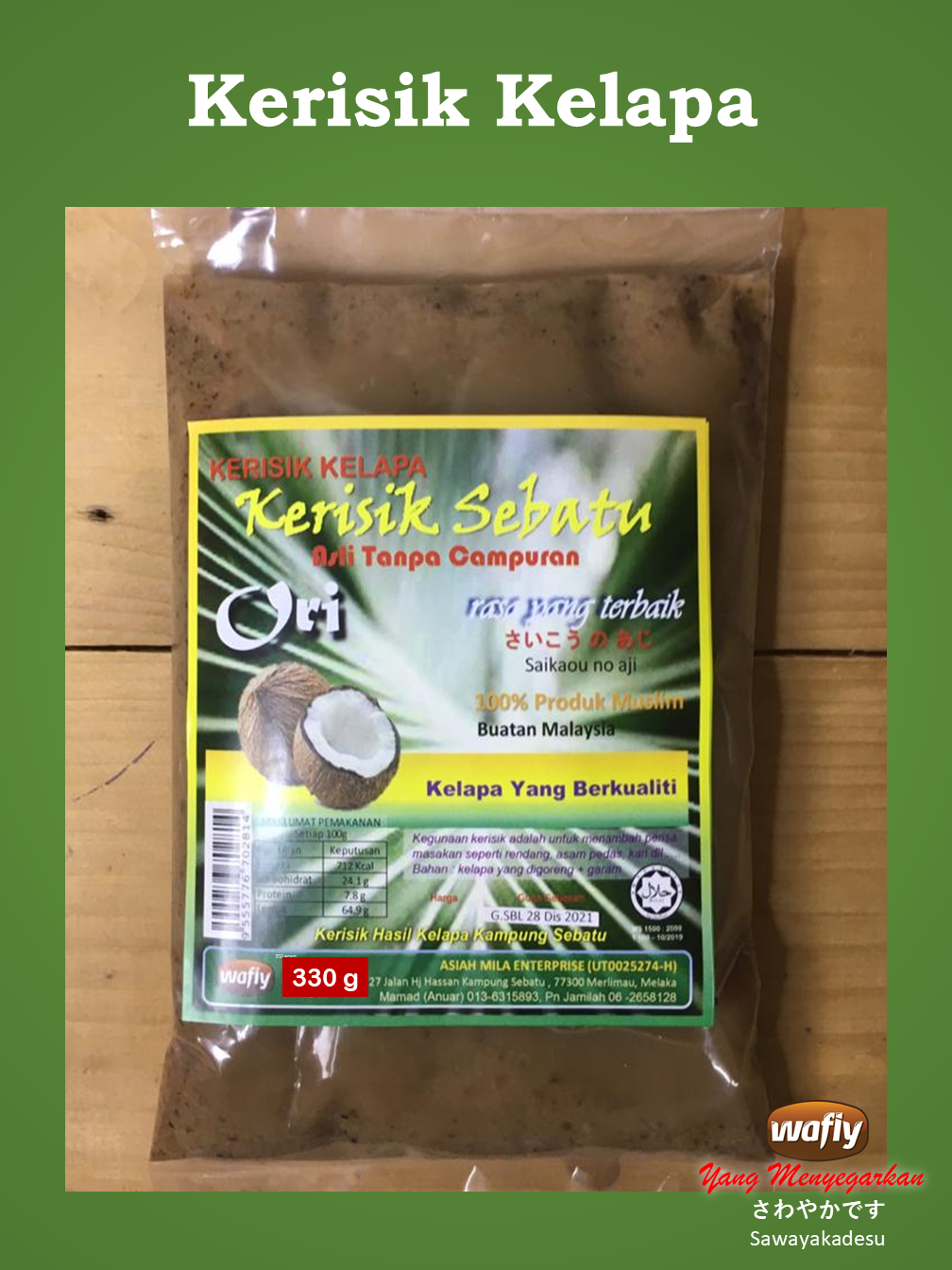 KERISIK KELAPA - 310 gramDibuat daripada hasil kelapa dari kampung Sebatu.Digoreng dan di mesin halus dengan menggunakan mesin masa kiniTiada campuran lain dan hanya kelapa sahaja serta sedikit garamSesuai untuk campuran untuk masakan Asam Pedas, Kari daging, kambing, ayam serta masakan rendang dan lain-lain masakanMenyedapkan masakan Telah mendapat status Halal, Mesti dan Logo Buatan Malaysia