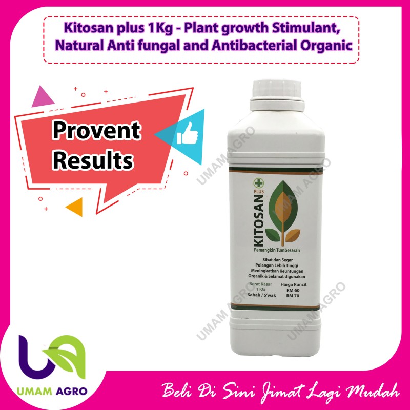 Kitosan adalah polimer organik yang bersifat mudah terurai diekstrak daripada cangkerang atau kulit makanan laut seperti udang dan ketam dihasilkan menggunakan aplikasi bioteknologi moden bertaraf antarabangsa.Kandungan asid amino yang terdapat pada kitosan dapat merangsang hormon pertumbuhan dalam setiap tanaman itu sendiri melalui penyerapan nutrien dari tanah. Ia sekali gus meningkatkan aktiviti sel tanaman dan proses fotosintesis serta meningkatkan sistem daya tahan tanaman berkenaan.Kitosan bertindak sebagai antibakteria semula jadi, mempercepatkan percambahan, meningkatkan hasil dan kualiti pertanian selain mesra alam serta haiwan. Ia mampu mempercepatkan pertumbuhan, mempercepatkan pembungaan dan pembuahan dan mempercepatkan masa tuaian. Kitosan boleh digunakan bersama baja dan kimia pertanian (racun) tanpa kesan sampingan, namun tidak boleh digunakan bersama bahan efektif mikro kerana ia akan membunuh bahan itu. · Panduan Penggunan : · Sayuran-Pokok Cili-Terung-Tomato dsb (Tanaman Rumah)· 2 - 3ml untuk setiap 1 Litre Air· Semburan 2 minggu sekali· Tanaman Kontan : Padi-Jagung-Tebu dsb· 3-5 ml untuk setiap 1 Litre Air· Semburan 1 kali sebulan· P Pokok Hiasan: Orkid Pokok bunga dsb· 2-3 ml untuk setiap 1 Litre Air· semburan 2 minggu sekali· Digunakan secara semburan pada seluruh bahagian tanaman (terutama bahagian bawah daun) dan sangat· bagus untuk siraman bancuhan ketanah.· Sukatan di atas hanya panduan cadangan untuk memudahkan sukatan. Terkurang atau terlebih sukatan tidak memberi kesan negatif pada tanaman kerana bahan Kitosan PLUS adalah ORGANIK.·