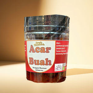 Adunan rempah tradisional menjadikan Acar Buah Rempah Warisan adalah sajian khas dengan cita rasa unik, menggabungkan kesegaran berbagai buah pilihan dengan keharuman rempah-rempah tradisional. Perpaduan rasa manis, asam, dan sedikit pedas menciptakan sensasi lazat yang menggugat selera.Dipadukan dengan rempah semulajadi tanpa bahan pengawet