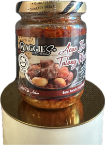 Ikan Talang Masin, Minyak Masak (Minyak Sawit), Cili Kering, Halia, Bawang Merah, Bawang Putih, Gula dan Cuka / Salted Doublespotted Queenfish, Cooking Oil (Palm Oil), Dried Chili, Ginger, Onion, Garlic, Sugar and Vinegar.