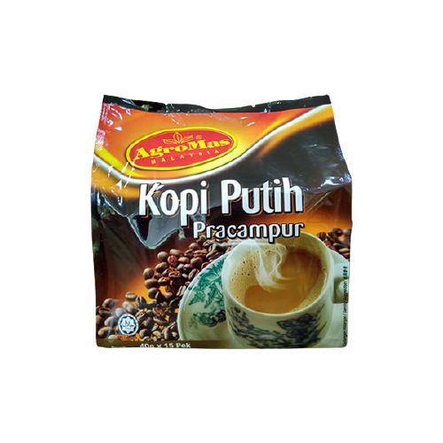 AGROMAS KOPI PUTIH / WHITE COFFEEBerat : 600 gram (40 gram X 15 sachet) Minumam pracampur kopi putih. Agromas menampilkan kopi yang diestrak dalam bentuk serbuk dan telah dicampur kremer dan gula. Aroma kopi yang harum dan citarasa premium yang sentiasa menjadi pilihan. Boleh dibancuh dengan mudah, hanya dengan tuang air panas bersuhu 90°C - 96°C, dikacau hingga sebati dan minuman sedia untuk dinikmati.#produkFAMA#produkHalal#keluaranbumiputra#agromas#ProdukBumiputera#ProdukAgromas