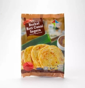 Doughy, Crispy and Fluffy layered Malaysian flatbread called Roti Canai.The dough is made of wheat flour and Halal ingredients.In the signature style of Malaysian ‘Mamak’ restaurant, Berkat Roti Canai is made by tossing the dough several times by hand instead of stamping it using a machine and pre-cooked the roti.It is a “Taste of a Delicious Traditional Recipe”.1 packet consists of 10 pieces of Roti Canai Segera Frozen (Pre-Cooked).:- Defrost completely and spread half a spoon of butter on each side of the Roti. :- Fry it on the pan and flip it for 5 minutes.
