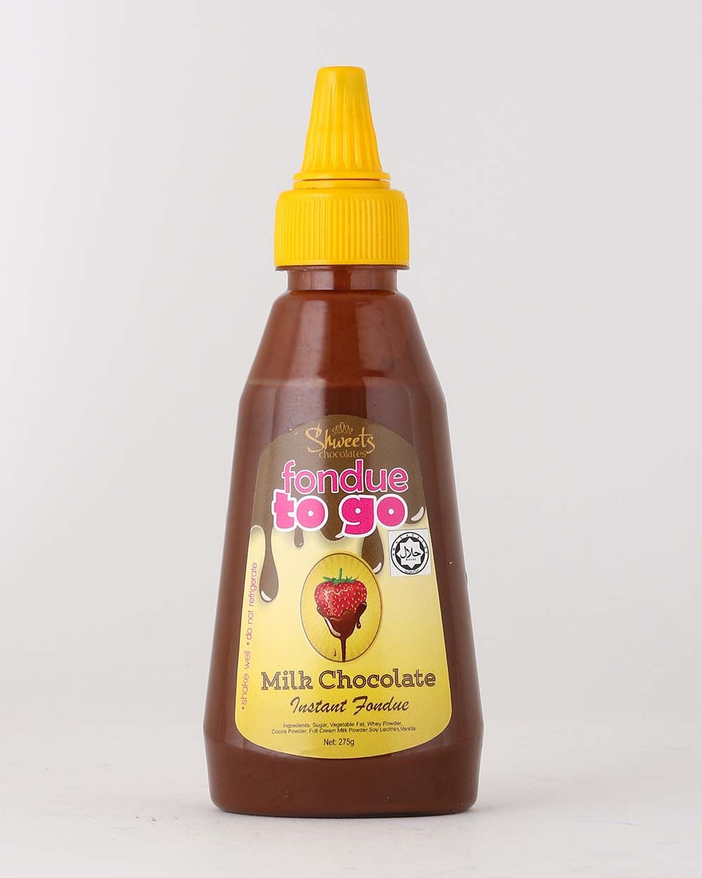 Instant chocolate fondue which is ready to use, just pour and enjoy the fondue with fruits (such as strawberries, grapes, bananas), biscuits, and marshmallows.Made with our delicious milk chocolate.Please refer to the back of the bottle for instruction.Weight: 280g