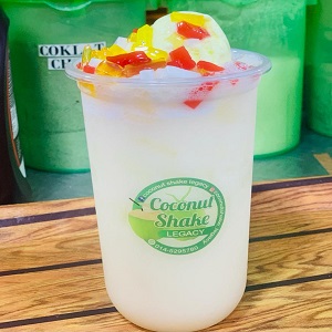 coconutshake yang diblend bersama susu cair dan aiskrim .