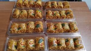 Eggroll Chicken Floss merupakan roti yang disalut telur dan dihias dengan daun sup dan cili besar..Sangat sedap bagi penggemar Chicken Floss..