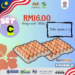 ? Dapatkan KOMBO SET C hanya RM16! ? ? Melalui Program FAMA Mobile Edisi Merdeka & Agrobazaar Online ?Kombo termasuk: ? TELUR AYAM x 2 PAPAN ? Jimat & berbaloi untuk keperluan dapur harian! ? Tempah sekarang di Agrobazaar Online