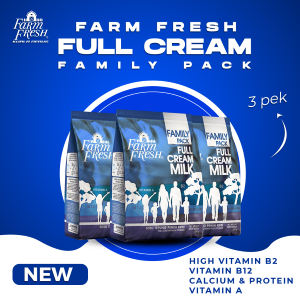 New!!!Fullcream Milk Farm Fresh Family Pack (Powder) 800g X 3 packHigh In B2High In B12Source of ProteinSource of Calcium Nutrition Per 100gEnergy 495.9KcalProtein 24.5gFat 26.3gCalcium 830mgMagnesium 80mgZink 80mgIngredients Full cream milk powder