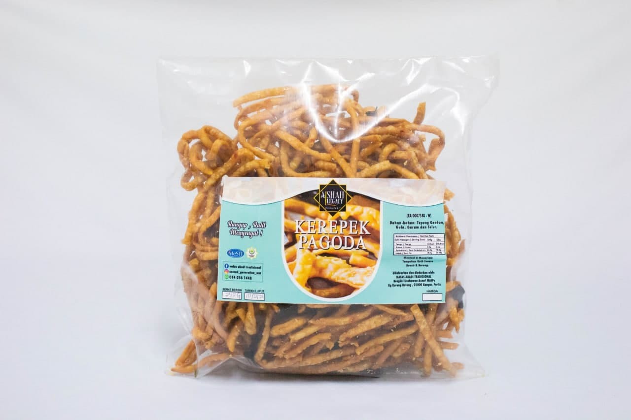 <p>KEREPEK PAGODA</p><p>Diperbuat daripada udang kering dan tepung gandum. Rasa ranggup dan sedikit pedas.</p>