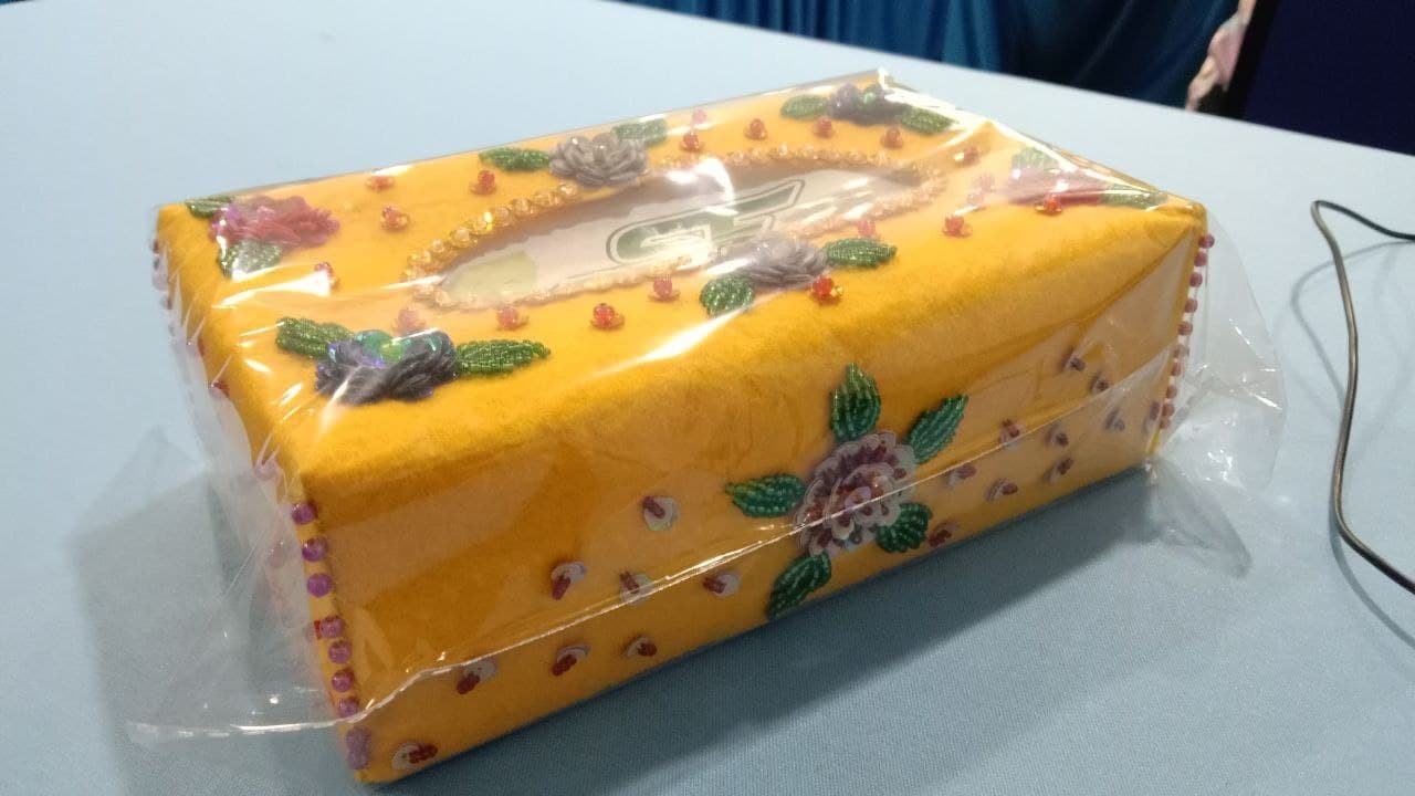 Kotak Tisu disulam mengikut corak flora dan bermutu tinggi. Boleh dipamerkan di semua tempat seperti dashboard kereta, meja makan dan macam-macam lagi.