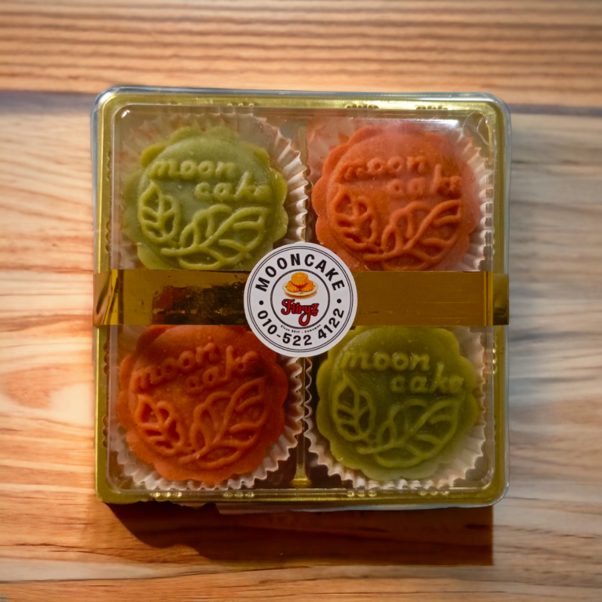 Setiap kotak mengandungi 4 biji kuih bulan. Ada dua biji perisa Red Bean Plain dan dua biji perisa Pandan Plain.