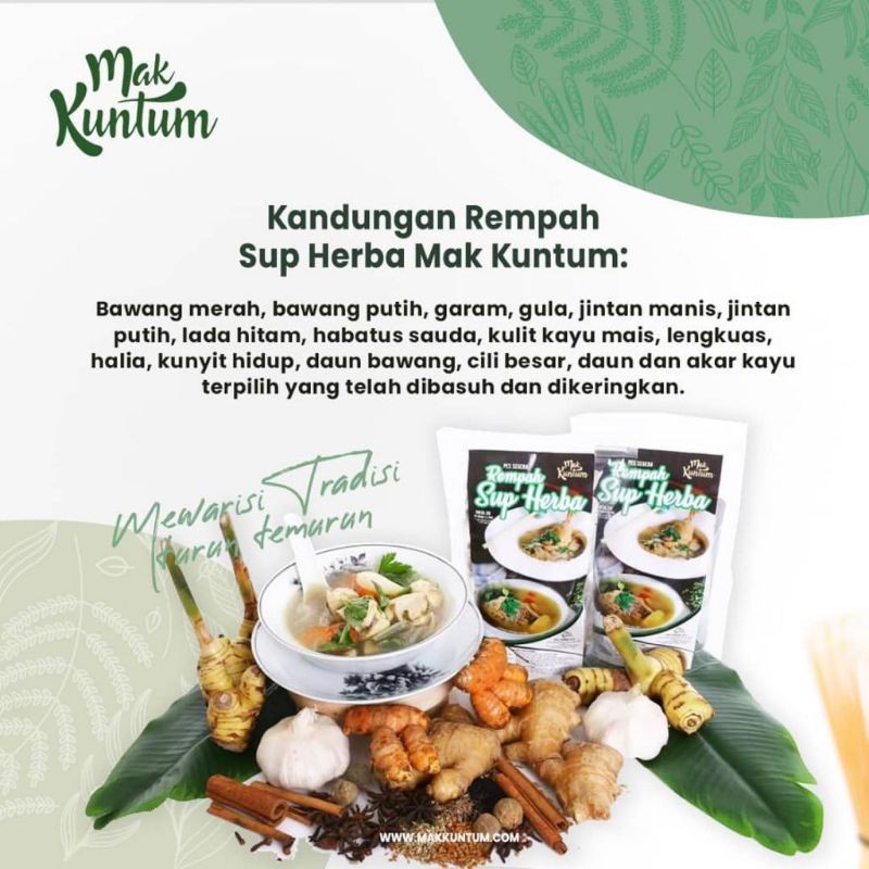 REMPAH SUP HERBA MAK KUNTUM85GMSETIAP PEK PES MAKANAN PANTANG MAK KUNTUM MENGANDUNGI 3 SET REMPAH SEGERA (SEALED FOIL PACK) BERSAMA DAUN SERAI,CILI, DAUN BAWANG YANG DIBUNGKUS SECARA BERASINGAN (REMPAH KERING)SESUAI DIMAKAN UNTUK :-IBU BERPANTANG-ORANG YANG BERDIET-PESAKIT SELEPAS PEMBEDAHANPENYEDIAAN MASAKAN SEGERA CEPAT DAN MUDAH SESUAI UNTUK IBU BERPANTANG.