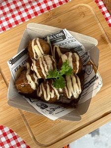Six homemade beef meatballs and two scoops of mash potato topped with black pepper gravy.