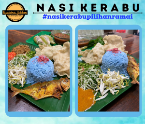 NASI KERABU DIHIDANGKAN BERSAMA SAYUR KOBIS, KACANG PANJANG, KESUM, TAUGEH, SERUNDING IKAN, BUDU, KUAHF TUMIS