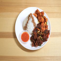 nasi putih ayam + daging goreng kunyit,taburan sayur kacang panjang,lobak merah dan bawang holland bersama kicap dan sambal belacan