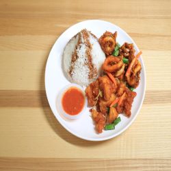 nasi putih ayam + sotong goreng kunyit,taburan sayur kacang panjang,lobak merah dan bawang holland bersama kicap dan sambal belacan