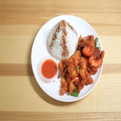 nasi putih ayam + udang goreng kunyit