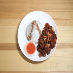 nasi putih daging goreng kunyit bersama kicap dan sambal belacan