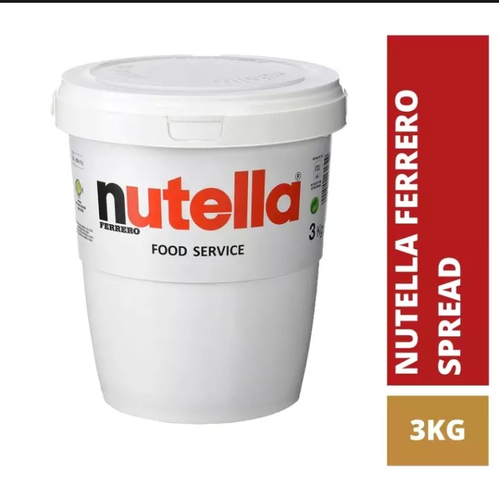 NUTELLA FOOD SERVICE HAZELNUT SPREAD WITH COCOA 3KG FERRERO FOOD SERVICE INGREDIENTS : Sugar, Vegetable Oil (Palm)*, Hazelnuts (13%), Fat-Reduced Cocoa Powder (7.4%), Skim Milk Powder (6.6%), Whey Powder, Emulsifier (Lecithins) (Soy). Flavouring. HALAAL STATUS "FERREO"Certified Haalal by the National Independent Halal Trust (N.I.H.T).Nutella source from Ferrero factories in Alba, Italy and from Lithgow, Australia and is Halal certified. Please refer to the National Independent Halaal Trust website www.halaal.org.za for more information. DISCLAIMERThis is very sensitive product due to delivery time. We wont responsible any damage from damage parcel.Please read carefully when purchase it.