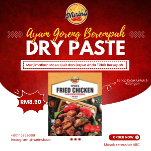 Mudah dan cepat! Pes Kering Ayam Goreng Berempah Nurins 50g kami akan jadikan masakan anda penuh rasa tanpa susah payah. Jom cuba hari ini!Untuk 5 HidanganCara Penyediaan1. Masukkan 500g ayam/daging ke dalam mangkuk kemudian masukkan 50g Pes Kering Ayam Goreng Berempah.2. Gaul rata sehingga sebati ke atas ayam/daging (seeloknya perap semalaman atau boleh juga perap selama 30 minit atau 3 jam)3. Seterusnya panaskan minyak, goreng ayam goreng berempah sehingga masak.4. Sedia untuk dihidangkanDapatkan Pes Kering Ayam Goreng Berempah Nurins hari ini dari Agro Bazaar Online