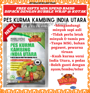 PES KURMA KAMBING INDIA UTARA by WAN SOOBerat Bersih: 100 gmJenis: Sedia-Untuk-DimasakHidangan Untuk: 3-4 orangKetahanan & Cara Penyimpanan Sebelum Dibuka: 24 bulan daripada tarikh pemprosesan. Simpan di suhu bilik sahaja.Ketahanan & Cara Penyimpanan Selepas Dibuka: Baki pes yang tidak digunakan HARUSLAH disimpan di dalam peti sejuk dan dihabiskan dalam tempoh 3 hari. Bekukan sahaja baki pes tersebut jika anda mencadang untuk tidak menggunakan baki pes dalam waktu terdekat.Bahan Ramuan: Minyak Sawit, Air, Tomato, Cili Hijau, Rempah, Bawang Besar, Halia, Bawang Putih, Minyak Sapi, Garam, Serbuk Kas Kas, Gula, Garam Masala, Serbuk Jintan Putih, Daun Pudina, Serai, Daun Pandan, Kulit Kayu Manis, Buah Pelaga, Bunga Cengkih, Bunga Lawang.Cara Memasak: 1. Rebus 400g-500g daging kambing dengan air sehingga empuk.2. Masukkan daging yang telah direbus, 1 pek Pes Kurma Kambing India Utara Wan Soo, 100ml air dan 40g santan kelapa atau susu cair.3. Panas di atas api sederhana selama 5-10 minit.4. Untuk rasa yang lebih enak, jumlah air yang ditambah boleh datang dari kombinasi air rebusan daging kambing dan air biasa atau hanya air rebusan daging kambing. 5. Sayuran seperti bawang,cili, daun pudina, daun ketumbar dan tomato juga boleh ditambah.6. Boleh juga tambahkan 1 sudu kecil yogurt dan sedikit perahan limau nipis pada penghujung proses memasak. Kacau sebati.7. Daging kambing boleh digantikan dengan daging lembu, ayam atau telur rebus.8. Hidangkan panas.Juga Boleh Digunakan Untuk Memasak: Kurma Ayam/Daging/Sotong/Telur RebusKeistimewaan:• Masak Kurma versi Indian style, lebih berempah, pekat dan ummphh daripada versi Melayu punya. Tak pedas. Sangat disukai kanak-kanak.• Sungguh cepat digunakan, pes sudah lengkap dengan minyak, minyak sapi asli, dan secukup rasa.• Tak perlu tumis pes ini dulu. Boleh terus tuang dalam periuk dan ikut arahan seterusnya.• Sangat menjimatkan duit dan masa. 400gm daging kambing boleh dihidangkan untuk 8 orang sebenarnya. Kalau rebus daging kambing menggunakan pressure cooker, lagi cepat hidangan ini siap.• Yang paling penting, dijamin HALALAN TOYYIBAN dan disahkan selamat untuk dimakan oleh KKM melalui persijilan MESTI.• Tanpa MSG, bahan pengawet & bahan pewarna.