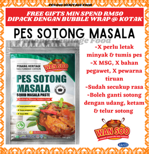 PES SOTONG MASALA by WAN SOOBerat Bersih: 100 gmJenis: Sedia-Untuk-DimasakHidangan Untuk: 3-4 orangKetahanan & Cara Penyimpanan Sebelum Dibuka: 2 tahun daripada tarikh pemprosesan. Simpan di suhu bilik sahaja.Ketahanan & Cara Penyimpanan Selepas Dibuka: Baki pes yang tidak digunakan HARUSLAH disimpan di dalam peti sejuk dan dihabiskan dalam tempoh 3 hari. Bekukan sahaja baki pes tersebut jika anda mencadang untuk tidak menggunakan baki pes dalam waktu terdekat.Bahan Ramuan: Minyak, Sup Tomato, Tomato, Bawang, Halia, Bawang Putih, Serbuk Cili, Gula, Garam, Daun Pudina, Kas-kas, Daun Kari, Serai, Asam JawaCara Memasak: Masukkan 400g sotong, 1 pek Pes Sotong Masala Wan Soo dan 250ml(1 cawan) air.Panas di atas api sederhana selama 15 minit atau sehingga sotong masak.Pastikan kuah agak pekat dan berpalut pada sotong baru tutup api.Sotong juga boleh digantikan dengan makanan laut lain seperti telur sotong, udang dan ketam.Hidangkan panas.Juga Boleh Digunakan Untuk Memasak: Telur Sotong Masala, Udang Masala, Ketam Masala (Sila rujuk FB Page/ IG Wan Soo Pes Nasi Kandar untuk melihat resepinya)Keistimewaan:Satu-satunya pes masala di pasaran.Kaya dengan rasa rempah dan pekat.Sungguh cepat digunakan, pes sudah lengkap dengan minyak dan secukup rasa.Tak perlu tumis pes ini dulu. Boleh terus tuang dalam periuk, letak air, sotong, buka api, biarkan sotong masak, kuah agak pekat berpalut pada sotong dan dah siap.Sangat menjimatkan duit dan tenaga. Boleh bayangkan tak kalau satu family 5 orang pergi kedai nasi kandar, setiap pinggan ambil salah satu antara sotong, udang, ketam, atau telur sotong, agak-agak berapa jumlah semuanya yang perlu dibayar???Yang paling penting, dijamin HALALAN TOYYIBAN dan disahkan selamat untuk dimakan oleh KKM melalui persijilan MESTI.Tanpa MSG, bahan pengawet & bahan pewarna.Jika berminat untuk mengikuti Home Dealer Programme kami sebagai seorang stokis/agen/dropship, Whatsapp kami di 019-480 9337.