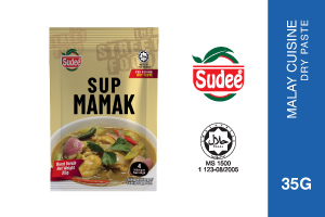 Spicy soup is a savoury, spicy and tangy soup. The classic spicy chicken soup consists of a clear chicken broth, often with pieces of chicken or vegetables.Ingredients: Vegetable oil, Onion powder, Garlic powder, Salt, Sugar, Ginger powder, Spices powder, Chicken fat, Soy sauce protein, Sodium Inosinate and Guanylate As Permitted Flavour Enhancer (Plant Origin) and corn starch.Preparation:Heat up30ml of oil, add 300gm of chicken and 35gm of Sudee Sup Mamak Dry Paste saute until fragrant.Add 500ml of water, chili (15gm), chopped onion (70gm) and celery (50gm).Cook until the soup boils and the chicken is cooked.Turn off the flame and ready to be served.