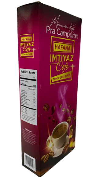 Imtiyaz Cofe Tanpa Gula PutihIMTIYAZ COFETanpa gula putih.Digabungkan dgn ekstrak kurma, delima, buah tin, mirifica, manjakani, nanas batu, vitamin c.15 sachet.