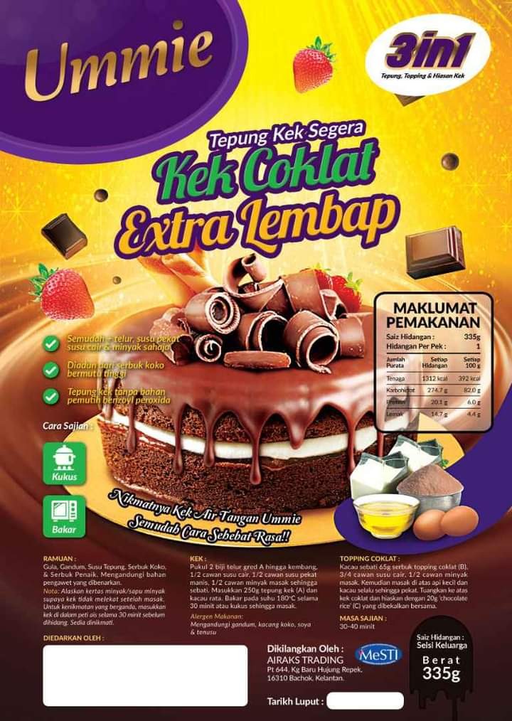 TEPUNG KEK COKLAT EXTRA LEMBAP UMMIEPilihan Utama Anda!!Ingin membaking sendiri didatangkan lengkap di dalam pack semudah + TELUR, SUSU PEKAT, SUSU CAIR & MINYAK SAHAJA.3IN1 LENGKAP BERSAMA TEPUNG,COKLAT GANACHE CAIR & HIASAN KEKCARA SAJIAN :KUKUS & BAKAR1001 TESTIMONI BERJAYA DARI 2014 LAGIPILIHAN TERBAIK UNTUK IBU-IBU UTK HIASI PELBAGAI MAJLISNIKMATNYA TEPUNG KEK UMMIE "SEMUDAH CARA SEHEBAT RASA"
