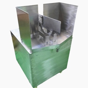 Young Coconut Cutting Machine COM92C2This machine automatically cuts the young coconut into two halves by using a cutting knife powered by the machine cam system. The young coconut juice is collected in a tray below and channeled out through a tube into a storage container.