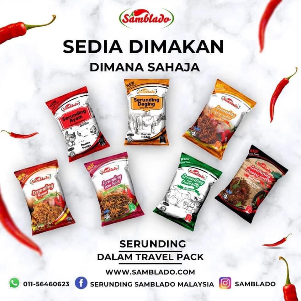 Serunding jenama samblado dirumus khas dari campuran isi daging, ayam,ikan, ikan bilis atau kambing bersama rempah ratus asli seperti bawang, santan, ketumbar, cili kering , gula dan garam yang dimasak selama 7 jam hingga 8 jam untuk memastikan serunding betul-betul masak dan tahan lama tanpa ada sebarang bahan kimia atau bahan pengawet. . Serunding jenama Samblado adalah sajian tradisi yang amat popular di Malaysia telah mendapat persijilan halal dari Jakim dan meraih pelbagai anugerah didalam dan luar negara antaranya Johan Serunding Peringkat kebangsaan sempena Hari peladang Penternak dan Nelayan 2013 , Johan Serunding Peringkat Negeri Kelantan 2016 dan silver medal euroinvent creativity and inovation at iasi romania. . Serunding samblado sesuai dimakan bersama ketupat, lemang, nasi, roti atau dimakan begitu sahaja.